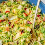 This shaved Brussels sprouts salad offers a delightful mix of textures and flavors and is one of the most delicious Brussels sprouts recipes. If you’re not sure if you like raw Brussels sprouts, I’m telling you, you will love them in this salad. We have here crunchy brussel sprouts, flaked almonds, and apples, nutty and flavorful parmesan and pecorino cheeses, sweet and sour pomegranate seeds, and dried cranberries, all tossed with a simple tangy dressing. This delicious salad goes well with anything!