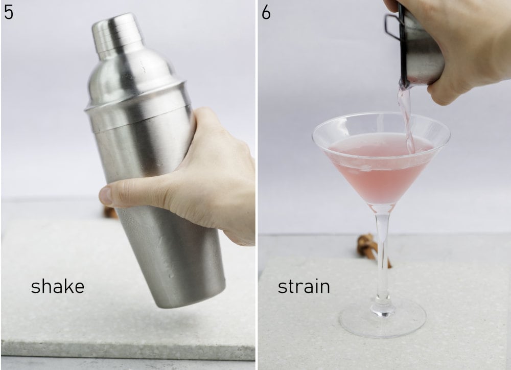 A glass for cosmopolitan cocktail: traditionally a martini glass is used for this cocktail. It’s a conical glass shown on the photos. I also like to use a coupe glass (another type of cocktail glass) for this cocktail.