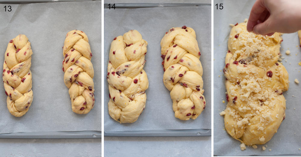STEP 15 (photo 13+14): Third rise: Place the braids on a baking sheet lined with parchment paper, cover with a plastic foil and leave to rise in a warm place for about 1-2 hours or until doubled in volume. I put them in the oven with just the light turned on.