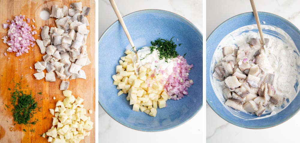 - Add the chopped herring and still until combined.