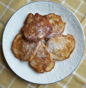 These pancakes are not overly sweet; they should be generously sprinkled with powdered sugar after being fried. I didn’t do this with the pancakes in the photos because if I dusted them with powdered sugar “grandma-style” you wouldn’t be able to see the pancakes at all, just the sugar 🙂