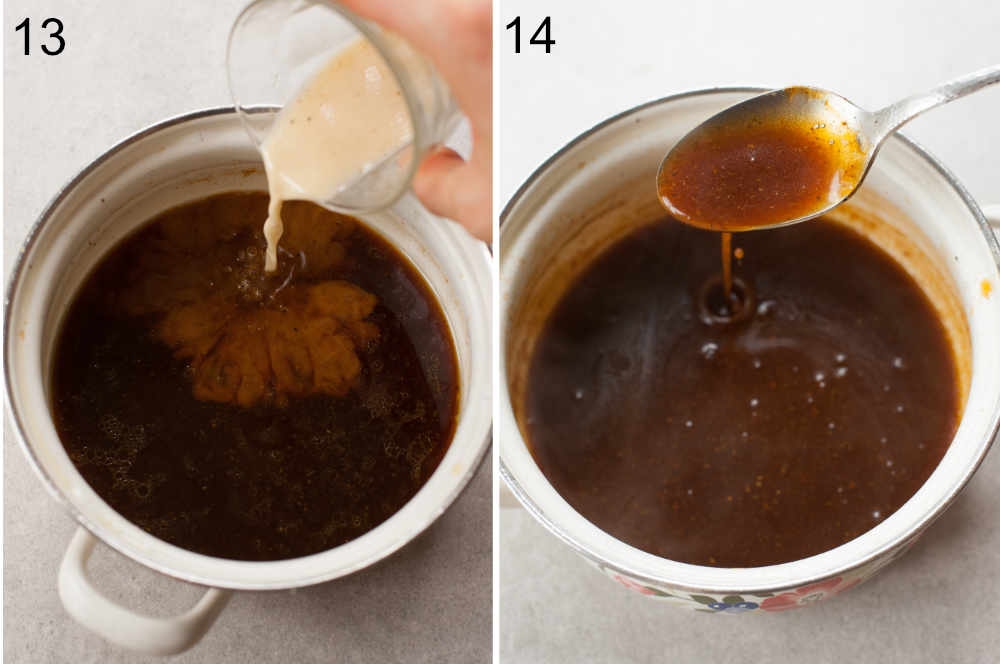 STEP 13: Pour the drippings into a small pot, add flour slurry (flour whisked with 2 teaspoons of cold water). Don’t add your flour directly to the hot drippings otherwise the gravy will be lumpy, always dissolve it first with some water.