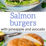 Juicy and flavorful salmon burgers with grilled pineapple, smashed avocado and sweet and sour pineapple bbq sauce!