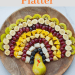 Turkey fruit platter is a fun and easy Thanksgiving appetizer for kids. It’s a great opportunity for kids to help with Thanksgiving preparations. If you’re not celebrating Thanksgiving it would be a hit at any kids’ party. My little daughter was more than happy to eat the “bird”!